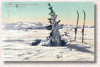 Winter an der Grenze Während die meisten anderen Karten, die Grenzsituationen zeigen, Grenzbeamte, Grenzschilder/-säulen, Gebäude oder ähnliches zeigen, könnte man hier von einem "Stillleben" sprechen. Ohne den Hinweis, dass es sich um die deutsch-französische Grenze handelt, wäre ich ratlos, was diese Ansichtskarte darstellt. Abgestempelt ist die Karte 1908 in Strassburg/Elsaß. Ein Grenzbeamter hat dieses Bild sicherlich nicht gemacht, denn - wo ist denn ein Grenzstein oder ein anderer Nachweis der Grenze zu sehen? Auch wäre er dann nicht alleine an diesem Ort gewesen, sondern wäre von einem zweiten Beamten begleitet gewesen (und hätte diesen fotografiert). Interessant ist auch die Darstellung. Die Skier wurden nur für dieses Bild dorthin plaziert (es sind nur Fußspuren - hin und zurück - erkennbar). Der Fotograf ist also von rückwärts gekommen. Was es ansonsten mit dem verschneiten Baum und der erkennbaren Grube auf sich hat ... ... ...