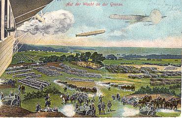 Zu Land, zu Wasser und in der Luft Auf dieser Karte kann ich leider nicht erkennen, wo das Szenario sich abspielt. Anhand der Aufmachung der Rückseite und anhand des Absenders/der Stempel vermute ich eine Gegend in Süddeutschland (Lörrach / Füssing). Jedenfalls wurde sie am 19.10.1914 als Feldpostkarte nach Hildesheim verschickt. Man sieht hier eine aufgestellte und kämpfende Armee an der Grenze, die aus der Luft unterstützt wird. Hier kämpfen gerade aktiv Flugzeuge und ein Zeppelin gegeneinander. Eine nähere Zuordnung des Motivs wäre sehr interessant, kann ich jedoch nicht liefern. |