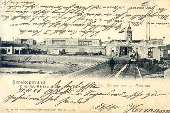 Ganz im Süden Dies ist eine sehr seltene Karte, da aus den Kolonien kaum Ansichtskarten bekannt sind. Zu sehen ist das Kaiserliche Zollamt, welches direkt an der Mole von Swakopmund in Deutsch-Süd-West Afrika lag. Der Zoll spielte in den deutschen Kolonien nur eine untergeordnete Rolle. Er war ausschließlich für die Einnahme der Zölle und in keiner Weise für die Grenzsicherung da. Dafür war das Militär zuständig. Diese hochinteressante Karte wurde 1904 von Swakopmund nach Berlin geschickt. Dem Absender gefiel es demnach in Swakopmund besser als in der Heimat, "denn ich habe hier eine sehr gute Unterkunft". |