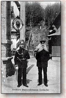 Diese Karte scheint da etwas anderes zu zeigen. Da steht ein herausgeputzter (in Ausgehuniform gekleideter) Beamter mit Reichsrevolver und Seitengewehr (augenscheinlich ein Aufsichtsbeamter), daneben ein "einfacher" Grenzaufseher. Dieser allerdings sticht durch ein markantes Aussehen, den Bart und den Kneifer hervor. Die Beamten stehen an der Schluchtgrenze, welche sich in Elsaß-Lothringen befand.