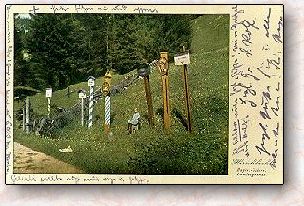 Soweit das "Märchen". Diese Karte zeigt sehr anschaulich, wie diese Schilderwut in Hirschbichl an der bayerisch-österreichischen Landesgrenze ausgelebt wurde. Um den eigentlichen Grenzstein, auf dem hier ein kleines Mädchen platziert wurde, sind tatsächlich 7 Schilder erkennbar, die Eigentumsansprüche und Anordnungen vermitteln. Es kann durchaus sein, daß an einer anderen Stelle mehr Schilder gestanden haben. Jedoch wurden diese hier sehr anschaulich in Szene gesetzt.